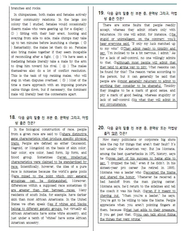 기초(중1과정)/기본(중2과정)/중급(중3과정)/고급(고교과정)/최고급(수능과정) 단계적으로 질문자의 수준에 맞춰 지도해드립니다. 어법성 판단, 제목, 주제, 요지, 필자의 주장, 내용 일치, 문장 순서배열, 무관한 문장 찾기)적중 문제와 답 찾는 법도 지도해드립니다.