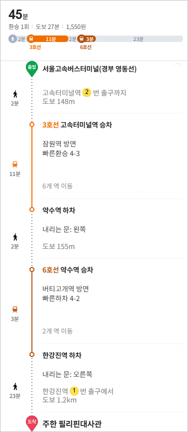 한강진역 하차 후 필리핀대사관 까지는 언덕길로 걸어가야해서 조금 힘들어요