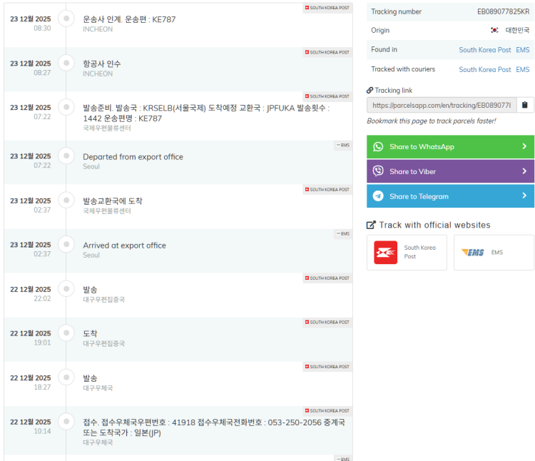 Ems언제 도착하려나요? 일본으로 보낸거고 어제 보냈는데 EB089077825KR인데 크리스마스에 도착할까요 나가사키로 보냇습니다