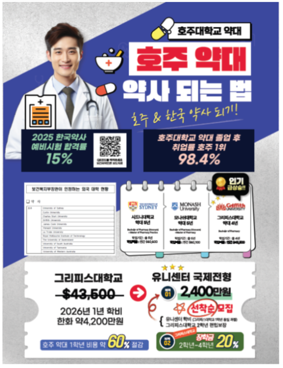 현재 26학년도 수능 결과 발표로 인해 많은 학생들의 지원 접수가 몰리고 있으며 약대편입전형의 경우 특히 정원이 빠르게 차오르고 있습니다. 최종 입학 결정까지의 모든 절차는 무료로 진행되며 호주약대편입을 고려하는 분들께서는 사전 무료 편입학허가서 발급을 통해 정원을 확보해두시기를 추천드립니다.