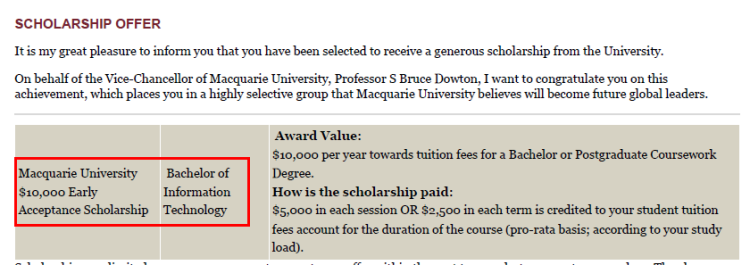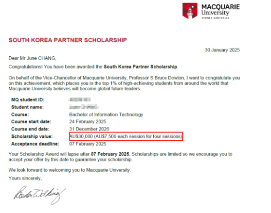 맥쿼리대학교는 유니센터 국제전형 프로그램을 통해 진학하는 모든 학생들에게 한화 기준 1,800만원의 장학금을 조건없이 지금해드리고 있으며 조건과 유니센터, 맥쿼리대학교의 선정에 따라 최대 2,800만원의 장학금을 적용해드리고 매 학기 학생들은 해당 장학금을 수여받으며 학업을 진행하고 있습니다.