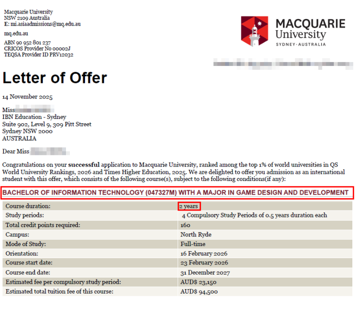 실제 유니센터 국제전형 프로그램을 통해 맥쿼리대학교 게임디자인&개발 전공 2학년으로 편입을 진행하는 학생의 편입학 허가서입니다. 기본적으로 호주대학교는 학사과정이 3년제로 진행되는데 유니센터에서의 학업을 면제 받아 졸업까지의 기간이 2년으로 명시된 것을 볼 수 있습니다.