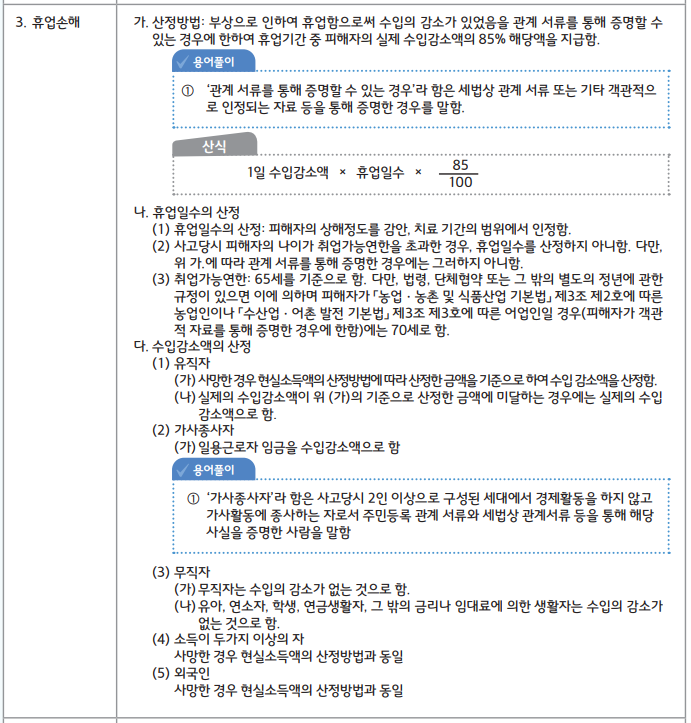 3. 치료기간내 피해자의 수입감소액의 85%(통상 65세 이상은 휴업손해액을 인정안함)