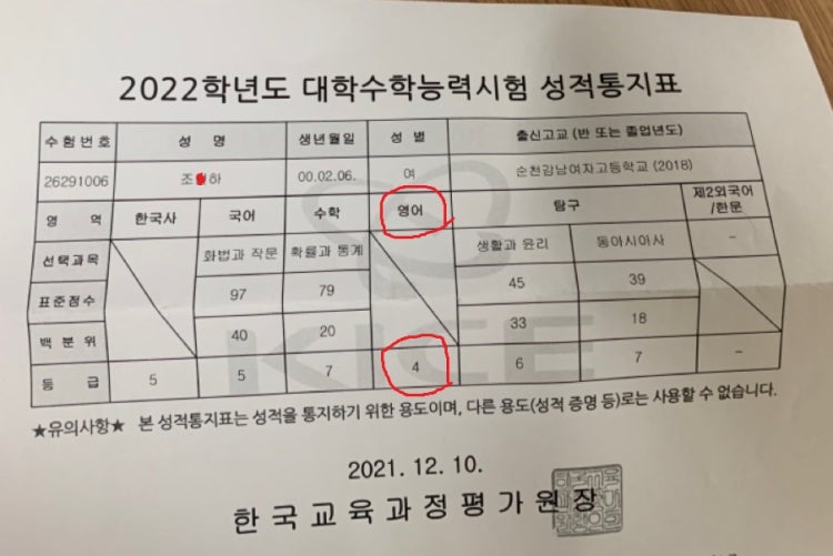 고3. 4등급 50일 수강하여 수능 2등급(성적표 확인 요망)